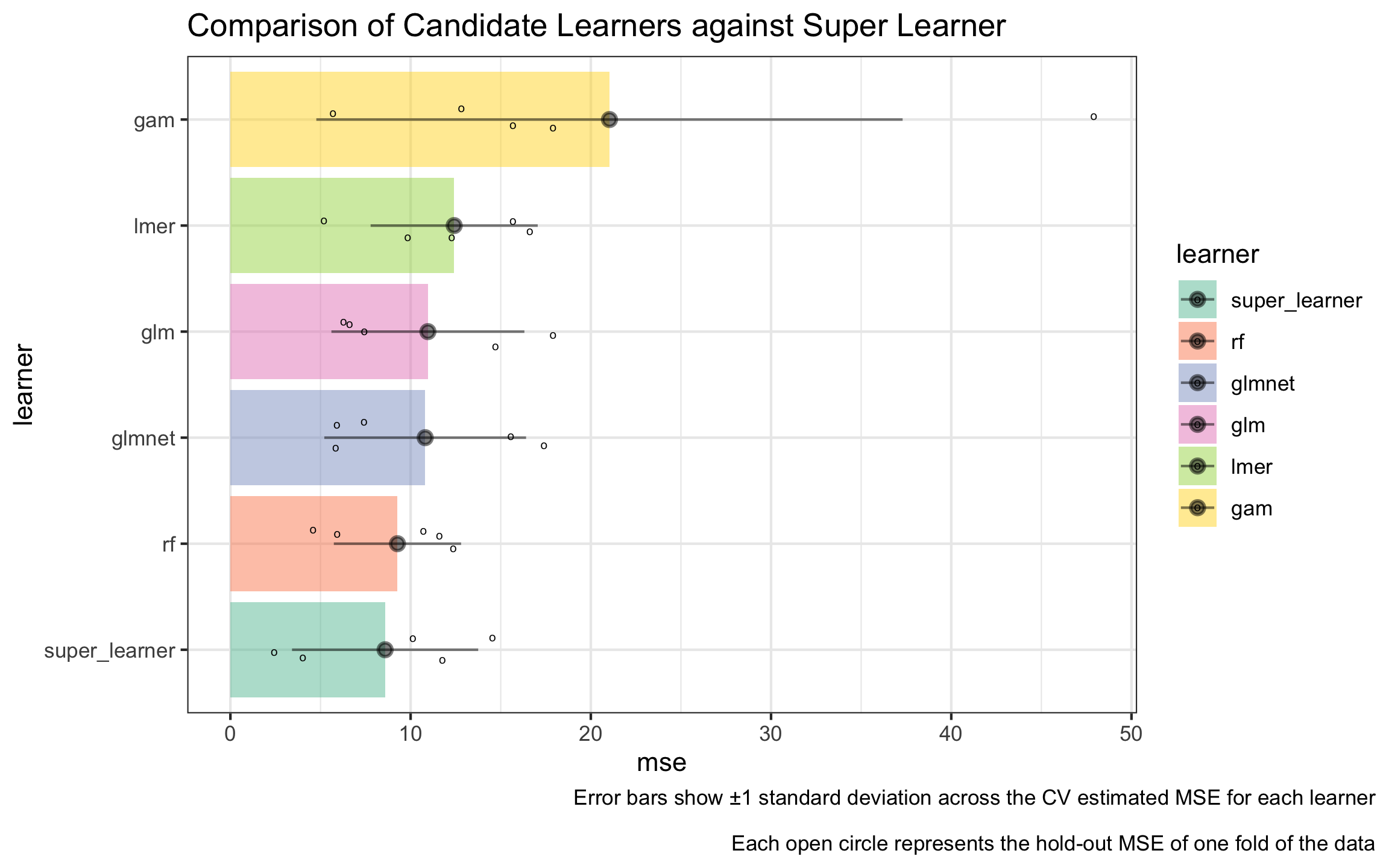 For example, it is easy to imagine the super learner algorithm being appealing to modelers fond of random effects based models because they may want to hedge on the exact nature of the random effects models, not sure if random intercepts are enough or if random slopes should be included, etc., and similar other modeling decisions in other frameworks.