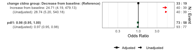 forestplotMV(glm_fit, data = pembrolizumab, include_unadjusted = TRUE)