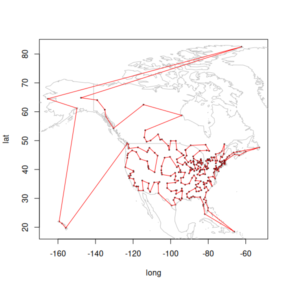 "https://cloud.r-project.org/"))Load a data set with 312 cities (USA and Canada) and create a TSP object.
