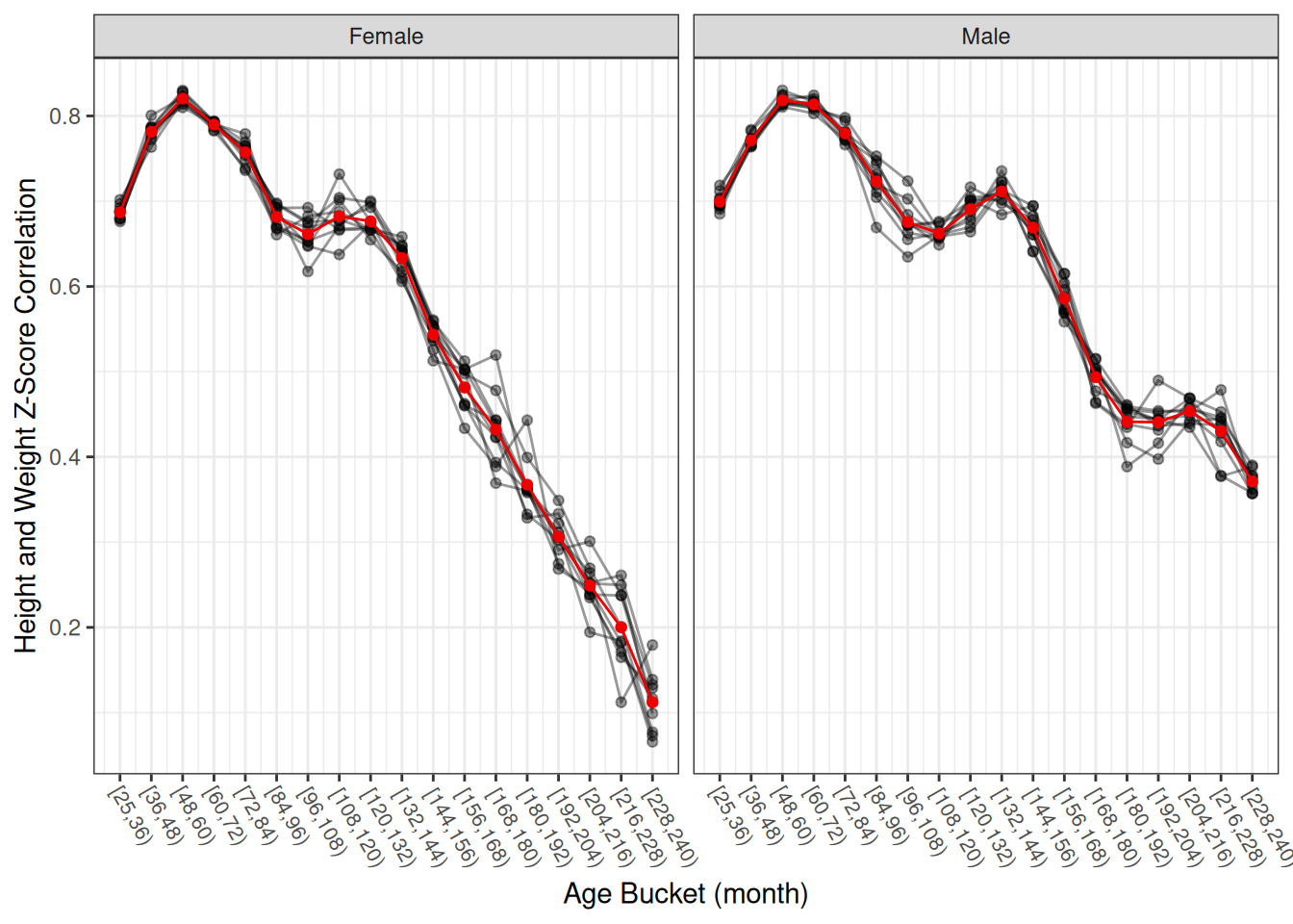 For young ages (birth to 36 months), CDC weight-for-stature growth charts can be used during simulations to enforce realistic correlations between height and weight. For later ages, such growth charts are unavailable. Therefore, to ensure realistic correlations between weight and height, the correlation between z-score of height and z-score of weight was optimized by sex and 1-year age bin.